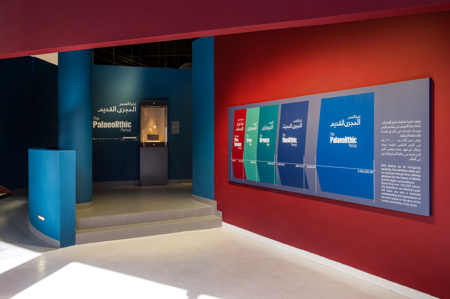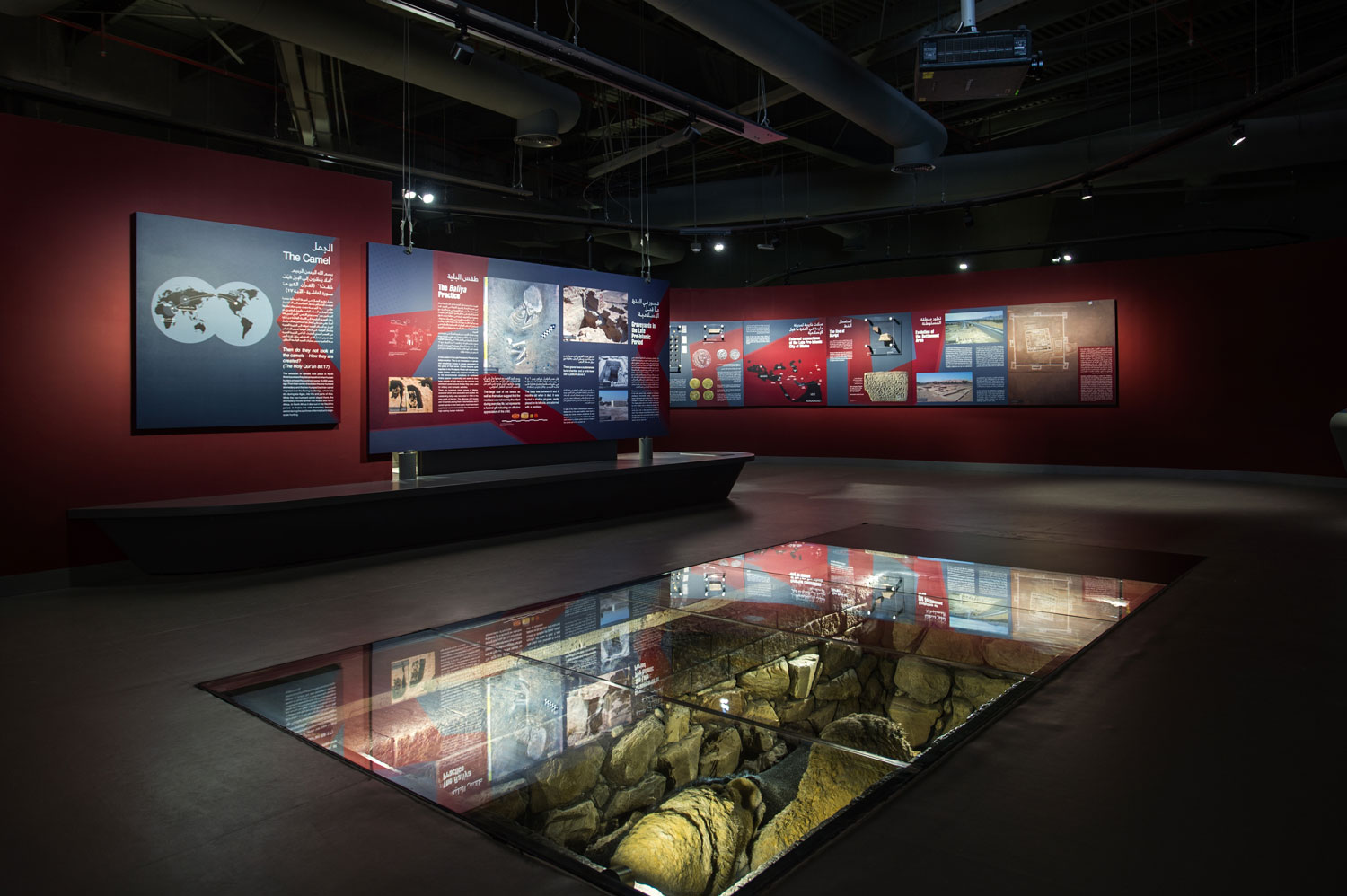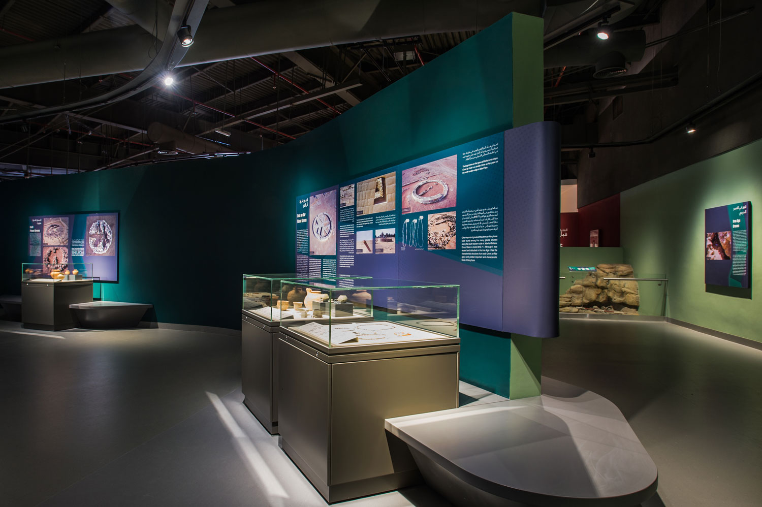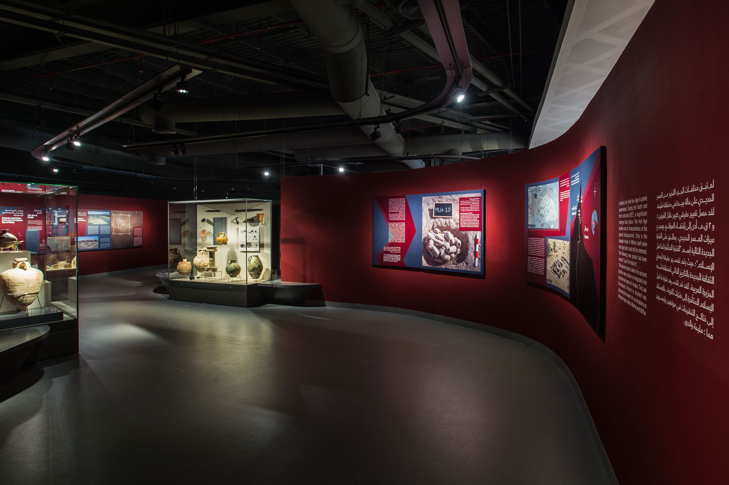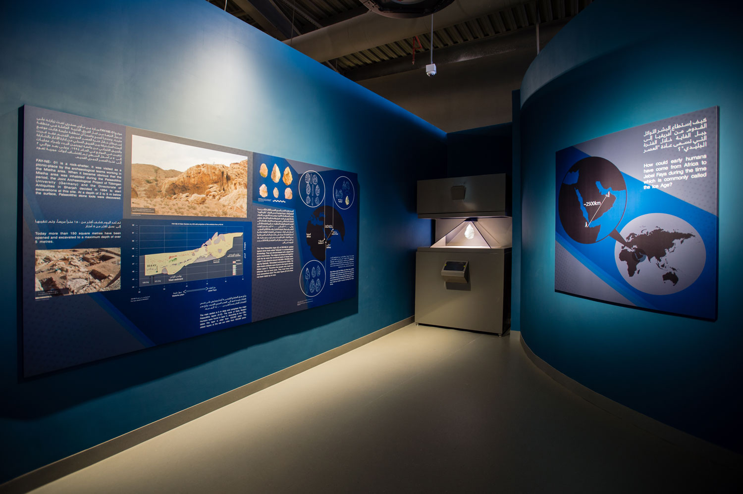 The project challenge was to tell the story of Mleiha over 125,000 years in one open space. To address this challenge, the 700 sqm exhibition space was split into zones creating a one-way chronological circulation going through the different historic ages of Paleolithic, Neolithic, Bronze, Iron, and Pre-Islamic. Color codes and leveling where used to differentiate between the different ages as the visitors walk through the exhibition space. Original objects excavated from the surrounding archaeological sites were put on display along with the use of various elements, such as models, scenography, multimedia and interactive digital displays to enrich the visitors experience and help interpret the storyline.