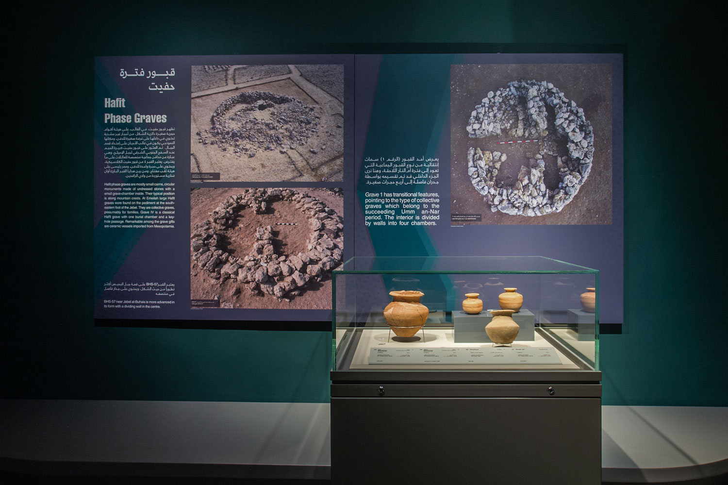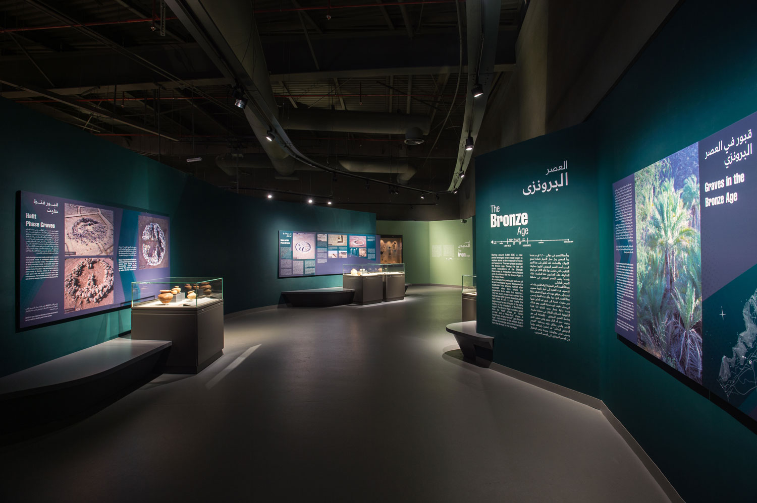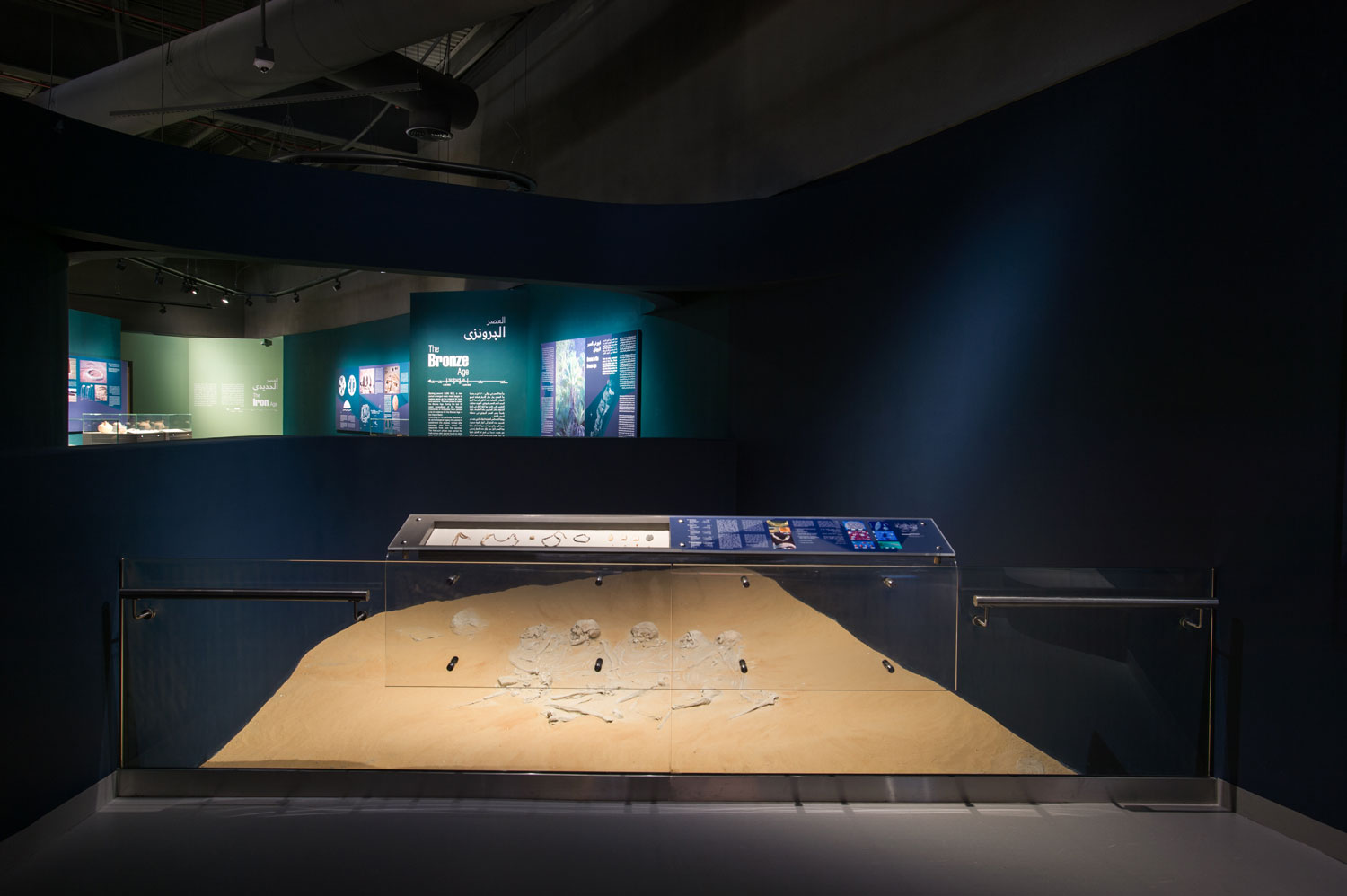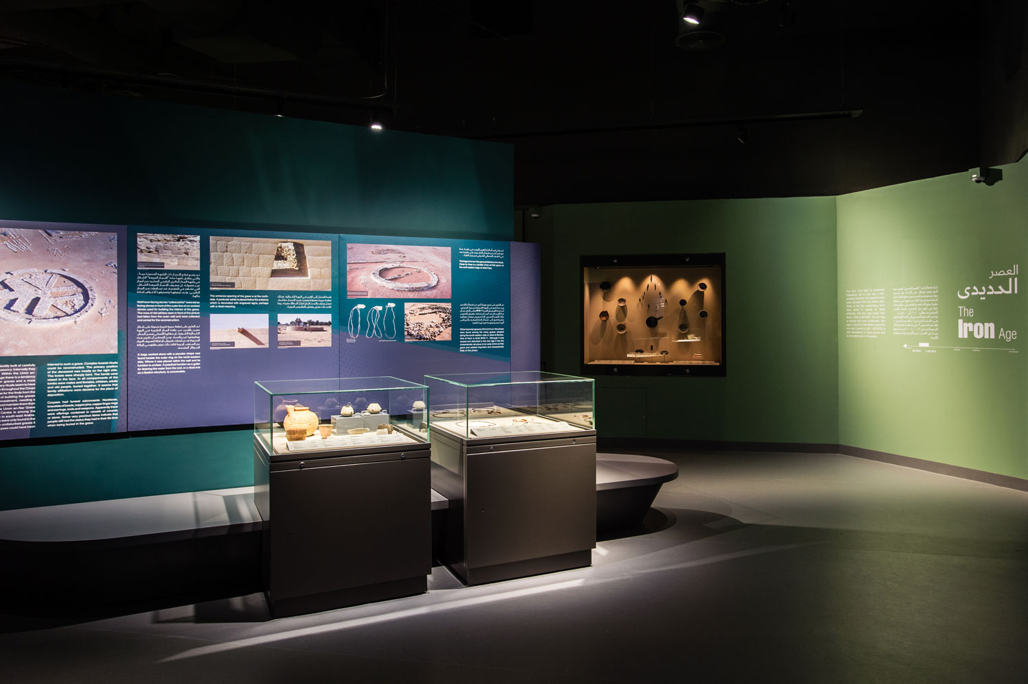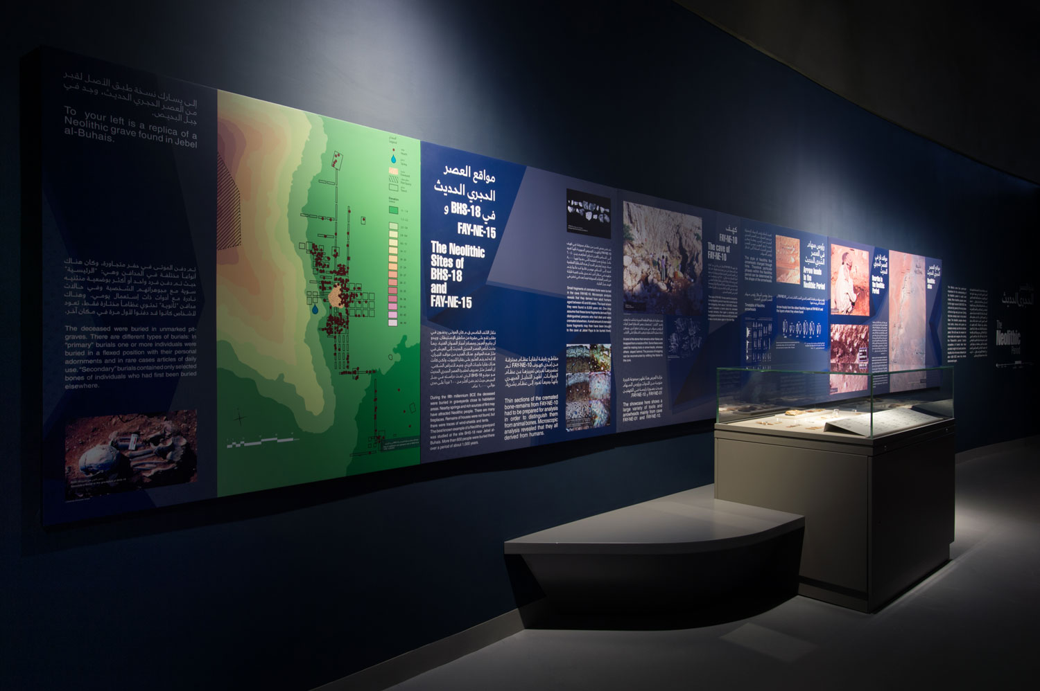 The project challenge was to tell the story of Mleiha over 125,000 years in one open space. To address this challenge, the 700 sqm exhibition space was split into zones creating a one-way chronological circulation going through the different historic ages of Paleolithic, Neolithic, Bronze, Iron, and Pre-Islamic. Color codes and leveling where used to differentiate between the different ages as the visitors walk through the exhibition space. Original objects excavated from the surrounding archaeological sites were put on display along with the use of various elements, such as models, scenography, multimedia and interactive digital displays to enrich the visitors experience and help interpret the storyline.